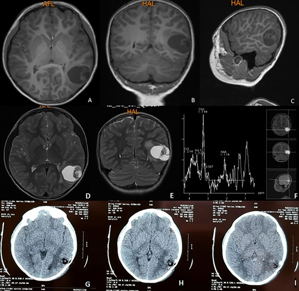 Figura 1. Resonancia magnética simple en secuencia T1. Se evidencia lesión ocupativa de espacio intraaxial temporal izquierda, quística, corticosubcortical hipointensa. A) Corte axial. B) Corte coronal. C) Corte sagital. En secuencias T2: D) Corte axial E) Corte coronal. F) Espectroscopía cerebral con pico de colina. G, H, I) Tomografía axial computarizada postquirúrgica: se evidencia estigma de craneotomía temporal izquierda, resección tumoral completa, lecho tumoral sin sangrado con material de hemostasia, escaso neumoencéfalo y moderado edema vasogénico.