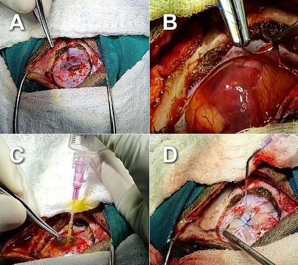 Figura 2. Imágenes transquirúrgicas. A) Durotomía. B) Aspecto quístico de lesión posterior a durotomía. C) Punción directa del quiste y obtención de líquido intratumoral amarillento. D) Duroplastia al finalizar exéresis tumoral.
