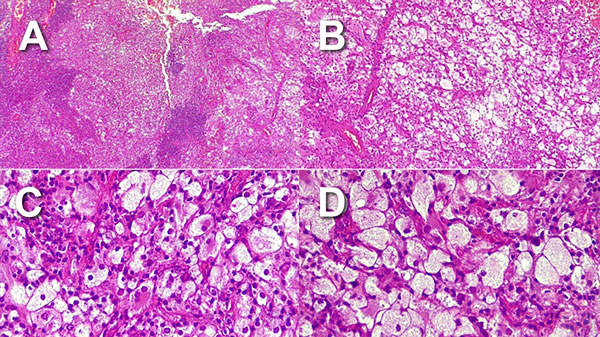 Histopatología: tumor intraaxial temporal compuesto por una población celular heterogénea: células de citoplasmas, amplios claros xantomizados con discreto pleomorfismo nuclear (Figura 3A), alternado con células de menor tamaño con núcleos excéntricos y nucléolos conspicuos (Figura 3B), así como linfocitos y células plasmáticas formando agrupaciones alrededor de la lesión (Figuras 3C y 3D).