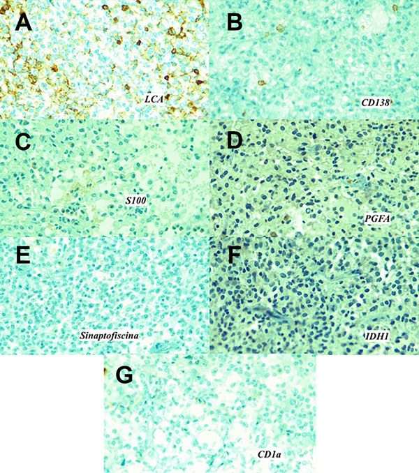 Figura 4. A) Antígeno leucocitario común (LCA / CD45). Población linfoide positiva. B) CD138 (sindecano-1) positivo. Inmunohistoquímica negativa para C) Proteína S100. D) Proteína gliofibrilar ácida (PGFA) (marcador de diferenciación glial). E) Sinaptofisina, (asociada a la vesícula presináptica). F) IDH-1 (isocitrato deshidrogenasa), no presenta mutación. G) CD1a.