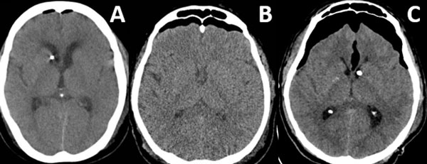 Figura 3. Neumoencéfalo ventricular. A) Leve. B) Moderado. C) Severo.