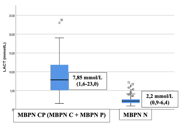 Figura 2. Medianas de lactato para los grupos de MBPN CP y MBPN N. MBPN CP: Meningitis bacteriana postneuroquirúrgica confirmada más Meningitis bacteriana postneuroquirúrgica presuntiva. MBPN N: Meningitis bacteriana postneuroquirúrgica negativa.