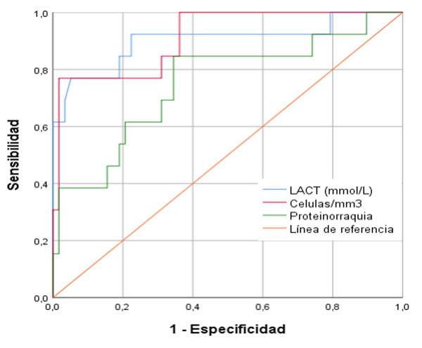 Se utilizó el software de análisis estadístico SPSS. Además, se aplicó el test de Mann-Whitney para comparar medianas de los valores de glucorraquia, proteinorraquia, recuento de células y lactato entre MBPN C, MBPN P y MBPN N, considerándose significativo una p <0.05. Para el resto del análisis de datos, MBPN C y MBPN P fueron combinados en un solo grupo de estudio (porque las medianas de dichos parámetros no resultaron significativamente diferentes entre ambos grupos). Se realizó curva ROC para determinar el área bajo la curva y punto de corte para lactato. Este se seleccionó aplicando el índice de Youden que reúne la mejor combinación de sensibilidad (S) y especificidad (E). Posteriormente, se armó una tabla de contingencia que proporcionó además de los valores de S y E, los valores predictivos positivos (VPP) y negativos (VPN) del punto de corte seleccionado. Para el análisis de correlación entre lactato y recuento de células, y entre lactato y proteinorraquia, se utilizó el coeficiente de Spearman.