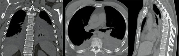 Figura 4: Caso 8. Hombre de 52 años, accidente vehicular de alta energía cinética. Fractura cerrada de antebrazo, síndrome de distrés respiratorio, hemotórax bilateral, hematocrito en descenso. Se diagnostico una fractura A4 de T8 con mínimo compromiso del canal espinal, posición en cifosis y hemotórax bilateral a predominio izquierdo.
