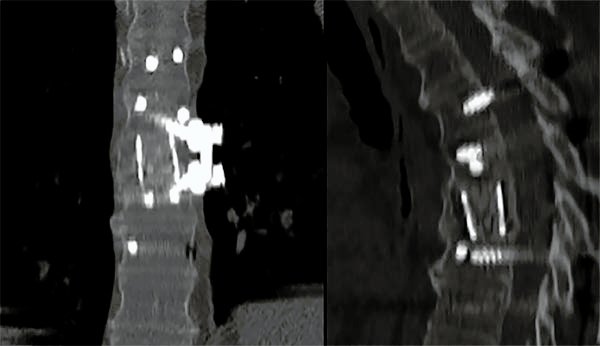 Figura 5: Caso 8. Se realizó una estabilización percutánea T6-T10. El paciente retornó a UTI, para estabilizar su cuadro respiratorio y hemodinámico.