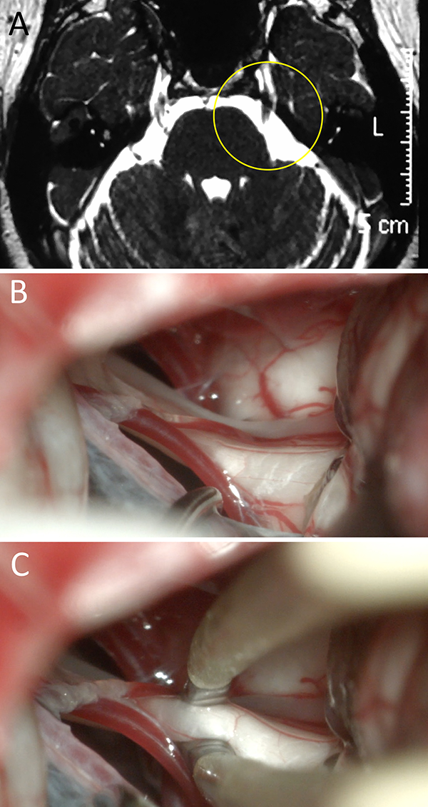 Figura 4: Mujer de 45 años de edad que presenta clínica de NT atípica refractaria a múltiples terapéuticas. En RM no se objetivo CNV. Ante persistencia del cuadro y el paciente expresó la voluntad de someterse a tratamiento quirúrgico. Se decidió DNV; durante la cirugía no se evidencio CNV alguno y se realizó neuropraxia. El paciente evolucionó con mejoría clínica. A) RM preoperatoria; B) hallazgo intraoperatorio; C) neuropraxia. NT: neuralgia trigeminal; RM: resonancia magnética; CNV: conflicto neurovascular; DNV: descompresiva neurovascular.