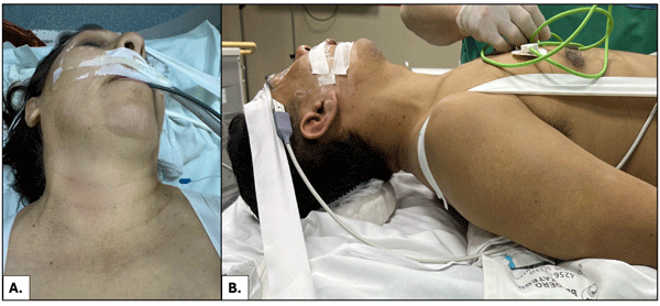 Figura 1. Posicionamiento del paciente. A) Vista frente. B) Vista perfil.