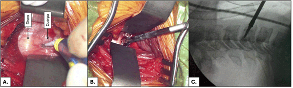 Una vez expuesta la columna vertebral, palpamos el cuerpo (depresión) y el disco (pico) e inmediatamente colocamos el pin de Caspar en el cuerpo (centro de la concavidad) orientado levemente en dirección cefálica. Interpretamos que si respetamos la dirección perpendicular al suelo, la colocación del pin incluirá uno de los cuerpos correctos. Se realiza control con radioscopia intraoperatoria y se continúa colocando el otro pin según la ubicación del primero (Figura 5). Actualmente no realizamos marcación con Abbocath en forma de bayoneta en el espacio discal ya que al respetar la dirección perpendicular de la marcación durante el abordaje la posibilidad de errar el nivel es prácticamente nula (en el caso de que suceda, retiramos el pin y lo colocamos en el espacio correcto), así se evita la colocación de elementos móviles transitorios, se reduce la exposición a rayos X y se disminuye un tiempo durante la cirugía.