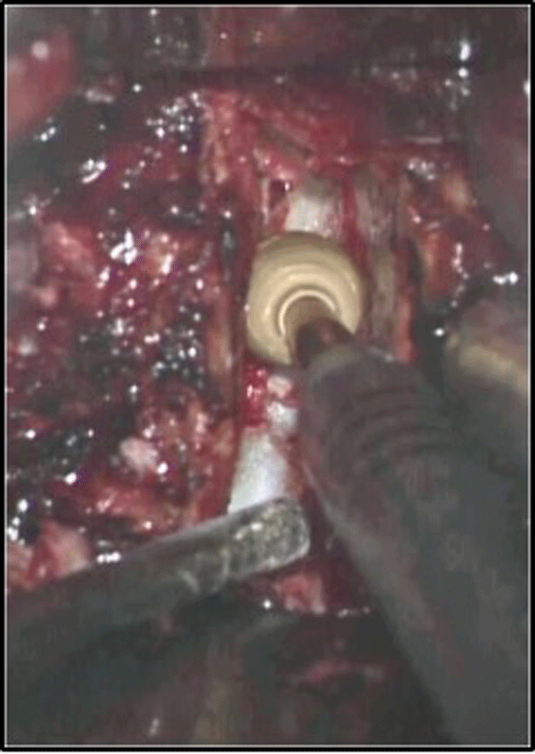 En este punto recomendamos la incorporación del microscopio quirúrgico. Preferimos fresas diamantadas grandes (el número dependerá de cada caso) por sobre las de pequeño tamaño ya que la forma de los bordes posteriores de los endplates disminuyen el traspaso accidental del drill al canal y además permiten un fresado de buena magnitud (Figura 8).