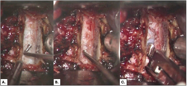 Figura 9. Resección del LVCP. A y B) Disección del ligamento. C) Resección del ligamento con Kerrison, se observa en profundidad color perlado de la duramadre.