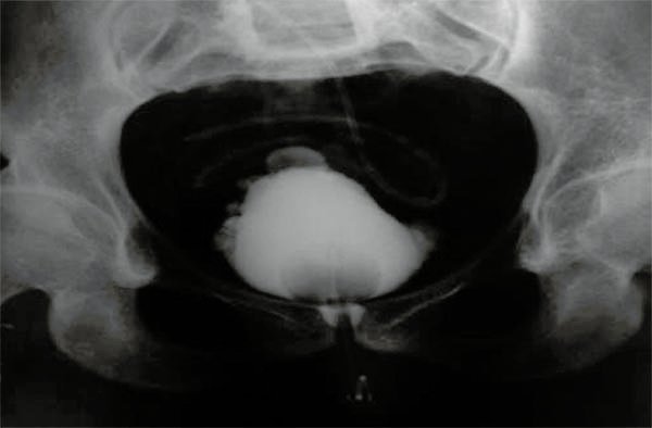 Paciente de sexo femenino de 34 años de edad con MMC Grado 3. Defecto del tubo neural corregido a las 6 horas de vida e hidrocefalia tratada con una derivación ventriculoperitoneal a los 12 meses de vida. No efectuaba cateterismo. Urograma excretor: normal. Incontinencia fecal y urinaria. Siempre uso pañales. A los 22 años de edad se realizó cistografía retrógrada con resultado patológico (fig. 2).