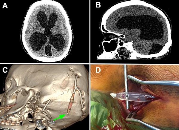 Figura 1. A y B. Corte axial y sagital de TC de cerebro evidenciando marcada hidrocefalia supratentorial. C. Reconstrucción 3D de dicha tomografía, se observa desconexión del catéter distal (flecha verde). Aclaración: sobre mastoides izquierda se evidencia catéter calcificado de válvula previa abandonada. D. Imagen intraquirúrgica con evidencia de desconexión de segmento distal.