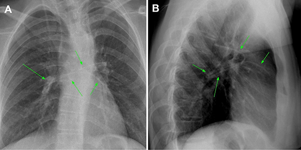 Figura 2. A y B. Radiografías de frente y perfil respectivamente realizadas previo a la intervención endovascular en donde se evidencia migración del catéter distal a la cavidad cardíaca (flechas verdes).