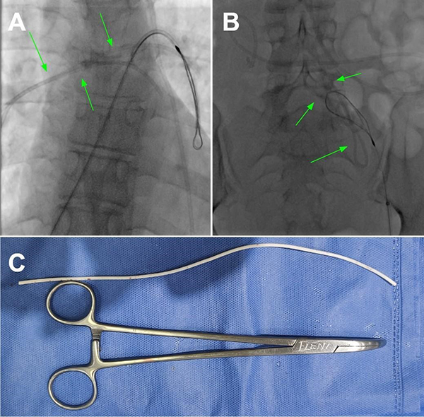 Figura 3. A. y B. Imágenes radioscópicas del procedimiento endovascular efectuado en el cuál se recupera y exterioriza el catéter distal migrado. C. Fotografía del catéter una vez retirado.