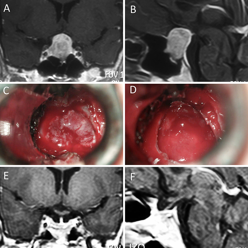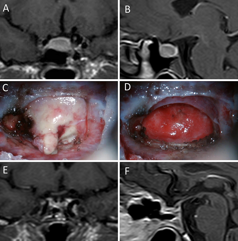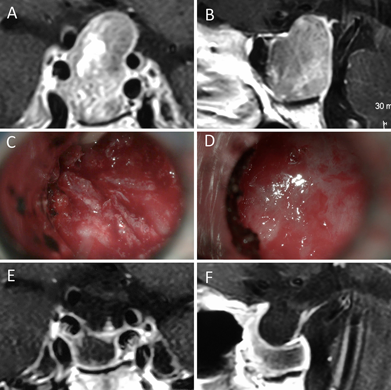 Figura 3: Macroadenoma no funcionante en un hombre de 64 años. El paciente presentó en el preoperatorio déficit visual que mejoró tras la cirugía. A-B: RM preoperatoria; C-D: intraoperatorio; E-F: RM postoperatoria.