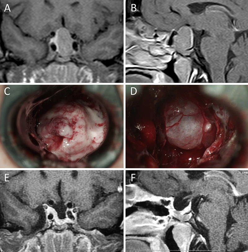 Figura 15: Prolactinoma en una mujer de 19 años. Cursó con cuadro de resistencia a la cabergolina. Se decidió tratamiento quirúrgico y evolucionó con remisión bioquímica. A-B: RM preoperatoria; C-D: intraoperatorio; E-F: RM postoperatoria.