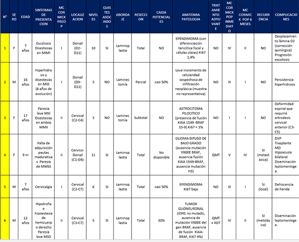 Methods: A retrospective study was carried out with patients under 18 years of age with a diagnosis of intramedullary spinal cord tumors, who had undergone surgical resection at our institution in the period 2019-2021. Presenting symptoms, pre and postoperative magnetic resonance, tumor lineage, intraoperative electrophysiology, degree of resection and clinical outcome were analyzed using the McCormick scale.