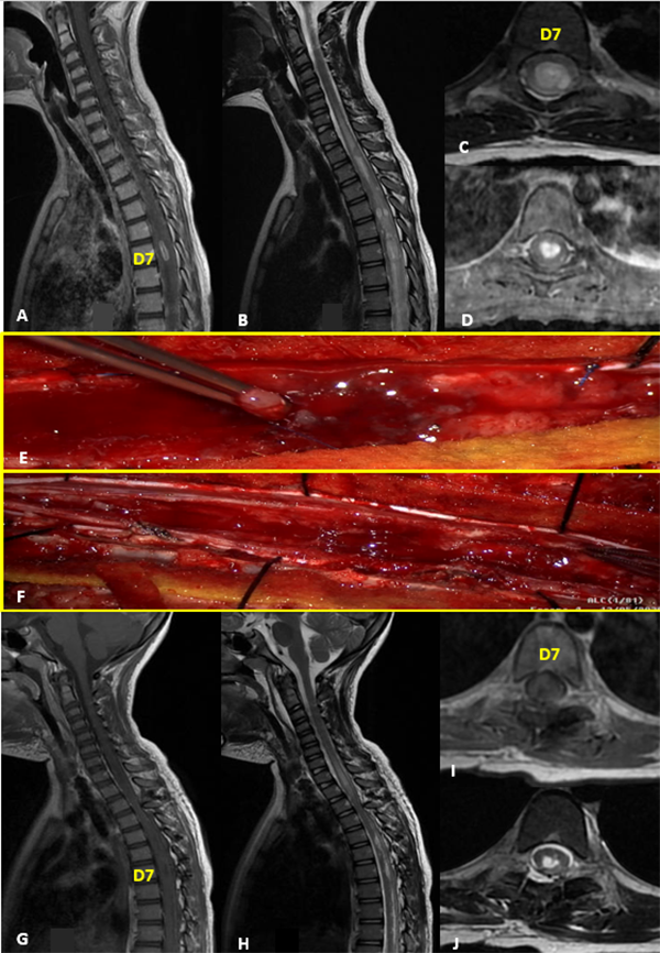 Paciente sexo femenino de 7 años sin antecedentes patológicos de relevancia que consulta por escoliosis y disestesias en miembros inferiores de 6 meses de evolución. Examen neurológico sin déficits motor. En la RM se objetiva extensa lesión intramedular de aspecto infiltrante y bordes poco precisos, extendiéndose desde la unión cérvico-dorsal al nivel D11, predominantemente hipointensa en T1 e hiperintensa en T2, con área de realce anular de aspecto quístico-necrótico a nivel D7. PESS alterados en miembro inferior izquierdo. Se realizó exéresis total de la lesión. El monitoreo neurofisiológico intraoperatorio evidenció episodios de disminución transitoria de la amplitud de la onda D, que revirtieron al detener la exéresis de la lesión. Los PEM no mostraron variaciones significativas. Presentó una paraparesia severa postoperatoria que mejoró progresivamente con rehabilitación. RM control postoperatoria evidencia resección tumoral completa con desplazamiento de lámina de D2 que requirió corrección quirúrgica. La anatomía patológica reveló ependimoma con diferenciación tanicítica focal y células claras. Actualmente sin recurrencia tumoral, en seguimiento estrecho por progresión de escoliosis (Figura 1).