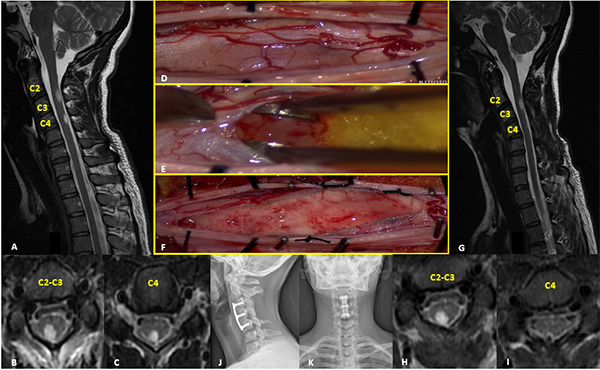 Figura 3: Astrocitoma Pilocítico. A-C: RM prequirúrgica T2 cortes axiales y sagitales. D-F: Imágenes intraoperatoria pre y postresección. G-I: RM postquirúrgica T2 cortes axiales y sagitales. J-K: Radiografía cervical frente y perfil post-instrumentación.