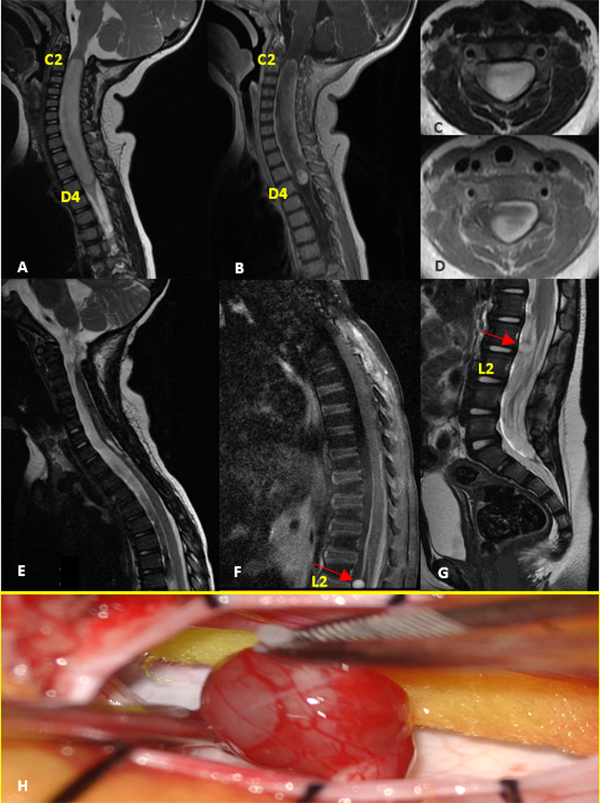 Figura 4: Glioma Difuso de Bajo Grado. A-D: RM prequirúrgica T1 con contraste y T2 cortes axiales y sagitales. E-G: RM postquirúrgica alejada que evidencia resección completa de tumor cervical con lesión metastásica nodular a nivel de L2 (flecha roja). H: Imagen intraoperatoria de la lesión.