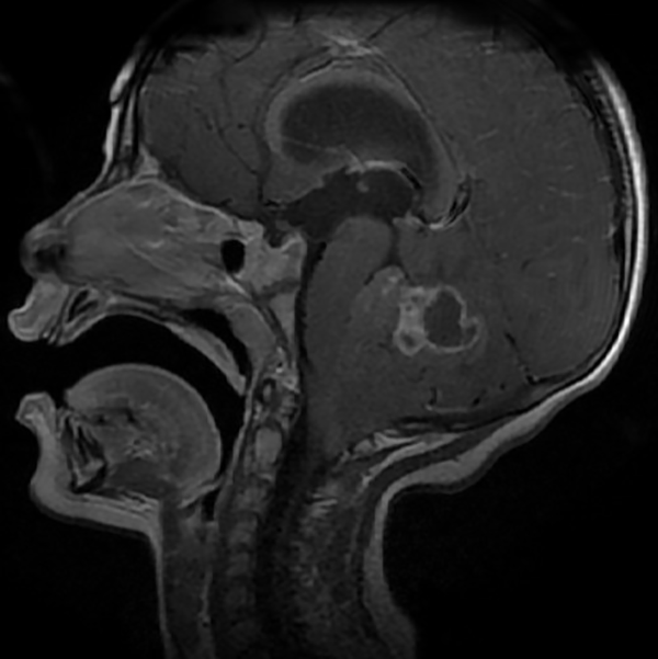 RM corte sagital, secuencia T1 con contraste. Se observa neoformación medial, solido-quística, heterogénea de bordes irregulares en la topografía del VI ventrículo que ocupa la totalidad del mismo, que realza en forma heterogénea tras la administración del contraste y se proyecta caudalmente a través del foramen magno. Se evidencia colapso del VI ventrículo, desplazamiento del tronco cerebral hacia anterior y abombamiento del cuerpo calloso debido a la hidrocefalia obstructiva.