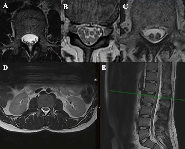 Figura 6: Imágenes de RMN lumbar en secuencia T2, a nivel L2. A- Configuración habitual del canal medular a nivel lumbosacro, se visualizan múltiples raíces nerviosas. A este nivel las raíces de la cola de caballo se ubican en el saco tecal a nivel dorsal, debido al efecto de la gravedad en el decúbito del paciente; B y C- Aglutinación y distribución irregular de raíces nerviosas, hallazgo característico de la aracnoiditis adhesiva; D y E- Imágenes de RMN de la paciente presentada, donde se observa aglutinación y engrosamiento de raíces nerviosas.