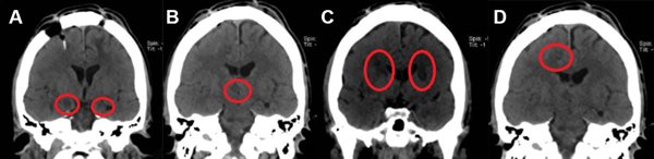Figura 2. TC de Cerebro postoperatorio en cortes coronales correspondiente al caso 2. Neurocirugía ablativa multitarget. A. Amigdalotomías bilaterales. B. Hipotalamotomía posteromedial derecha. C. Capsulotomías anteriores bilaterales. D. Cingulotomía anterior derecha.9