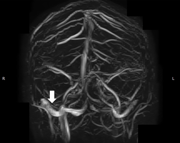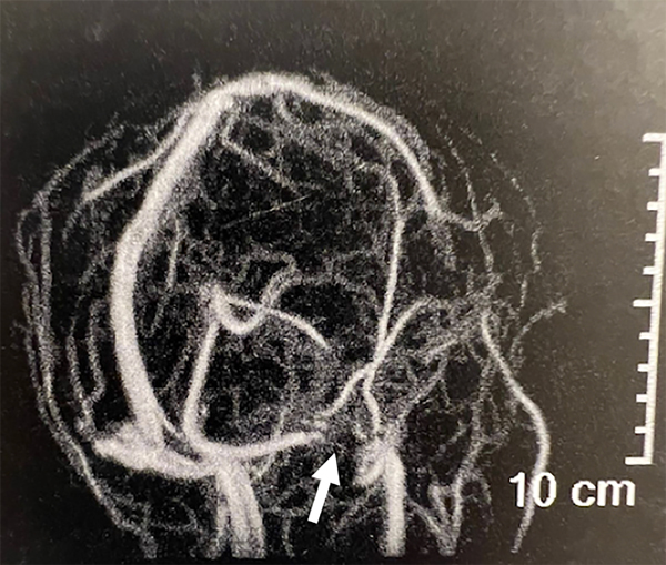 Figura 1: Angioresonancia en tiempo venoso. La flecha blanca señala la estenosis del seno transverso derecho.