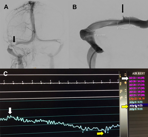 Figura 2: A) Angiografía cerebral digital con adquisición frente en tiempo venoso. La flecha negra señala la estenosis del seno transverso derecho. B) Detalle de la venografía digital en la unión de los senos transveros y sigmoideo. Se detalla la medición del seno transverso en los segmentos estenosado y no estenosados. La flecha negra señala el catéter de acceso distal localizado en la porción proximal a la estenosis. C) Imagen del monitor durante la medición de tensión venosa en todo el trayecto del seno transverso. La flecha blanca marca la medición a nivel proximal a la estenosis (presión media 20mm de Hg). La flecha amarilla marca la medición a nivel distal a la estenosis (presión media 5mm de Hg). El gradiente de presión a través de la estenosis es de 15mm de Hg.