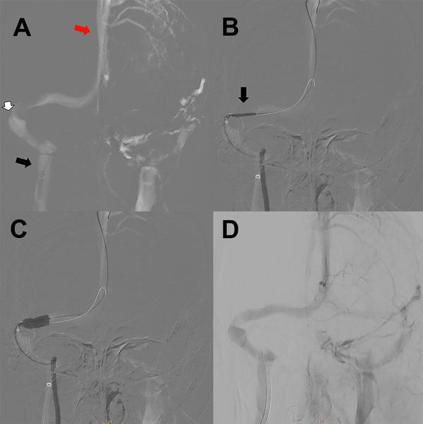 Figura 3: A) Imagen angiográfica en modo roadmap incidencia antero-posterior en tiempo venoso. La flecha negra muestra el extremo distal de la vaina carotídea a nivel del golfo de la vena yugular. La flecha blanca indica el extremo distal del catéter de acceso distal en el seno sigmoideo. La flecha roja muestra el extremo distal de la microguía 0.014 a nivel del seno longitudinal superior. B) Imagen angiográfica en modo roadmap incidencia antero-posterior en tiempo venoso. La flecha negra muestra el stent balón localizado en la posición de la estenosis previo a la impactación del mismo. C) Imagen angiográfica en modo roadmap incidencia antero-posterior en tiempo venoso. El balón ya fue inflado en el sitio de la estenosis. D) Angiografía cerebral digital con adquisición frente en tiempo venoso luego de la impactación del stent en el seno transverso derecho sin estenosis residual.