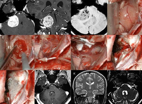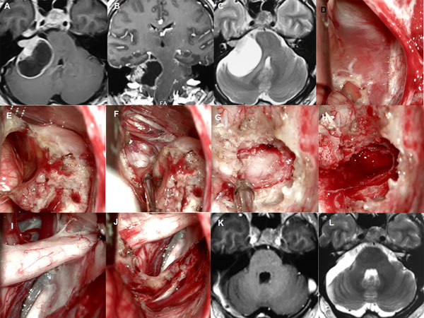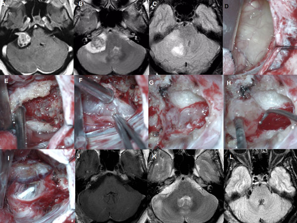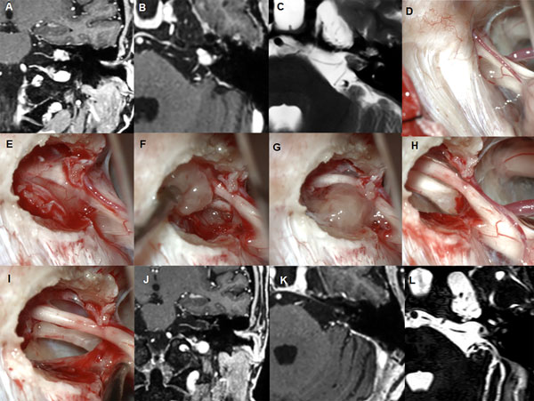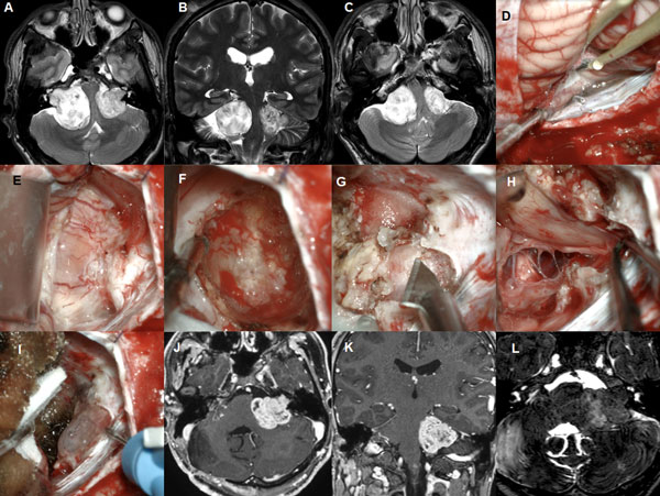 Figura 5: Paciente masculino de 18 años, operado de SV T4b bilateral. A-C: RM cerebral preoperatoria. D-I: imágenes intraoperatorias (lado derecho), D-F descompresión intratumoral con aspirador ultrasónico, G-H descompresión del complejo VII-VIII, I: oclusión del CAI con cola de fibrina., J-L: RM cerebral postoperatoria