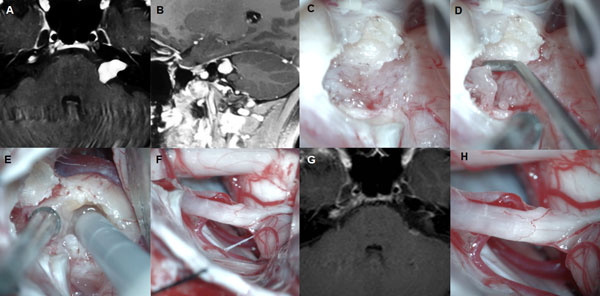 Figura 3: Paciente femenino de 40 años, operada de SV T3b izquierdo. A-B: RM preoperatoria. C-F: hallazgos intraoperatorios. G: RM postoperatoria, H: imagen intraoperatoria del lecho tumoral y descompresión del complejo VII-VIII