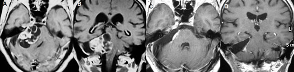 Figura 8: Paciente masculino de 62 años, operado de SV T4b multiquístico. A-B: RM preoperatoria. C-D: RM cerebral postoperatoria.