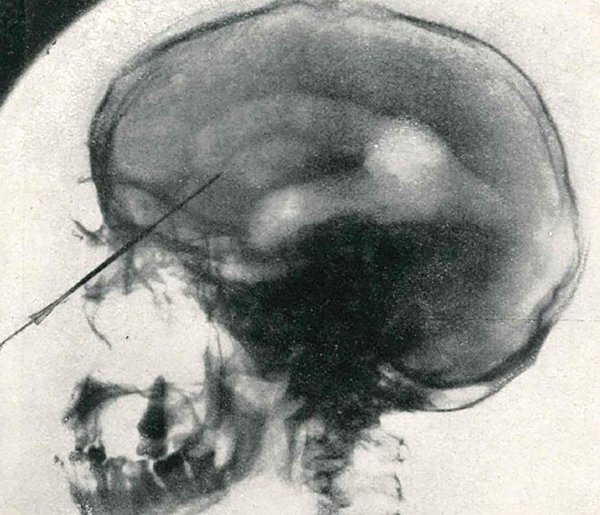Figura 1: Descripción original de la neumoventriculografía por vía transorbitaria en un paciente portador de hidrocefalia.1 Se aprecia el ventrículo lateral contrastado por aire y la punta de la aguja en el cuerno frontal.