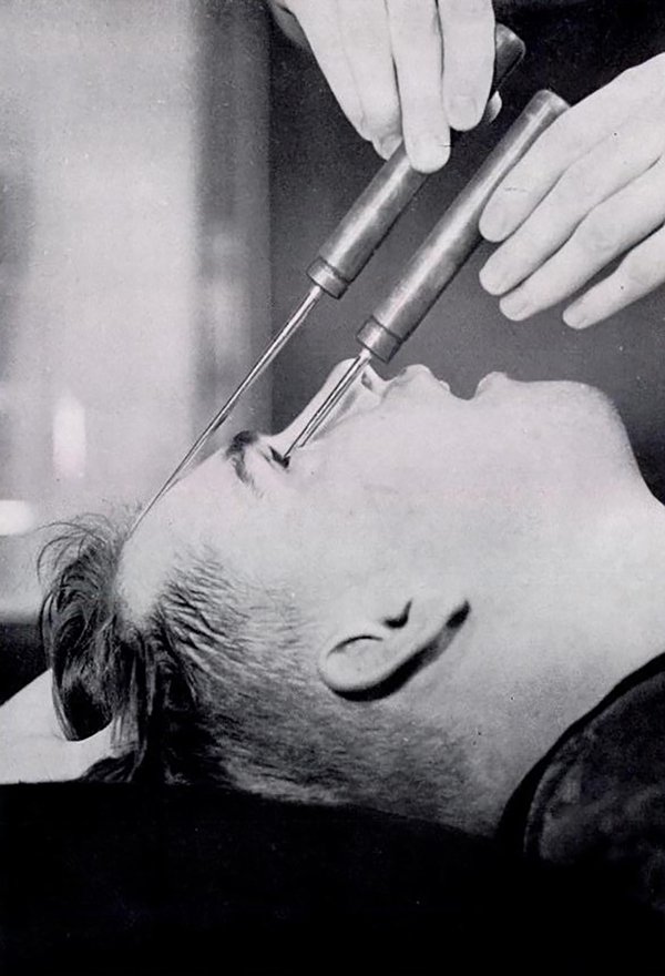 Figura 3: Lobotomía prefrontal según la técnica de Freeman. Para Freeman,3 no era necesario preparar el campo operatorio, ya que consideraba al saco conjuntival como normalmente estéril. En esta figura se aprecian dos leucótomos similares: uno de ellos a una profundidad de 7 cm, orientado ligeramente hacia la línea media y siguiendo un eje paralelo al del dorso nasal. El segundo leucótomo sirve para estimar la posición de la punta del primero a nivel cerebral. La trayectoria, cuya prolongación imaginaria alcanzaría la sutura cononal, pretendía evitar las cavidades ventriculares. Reproducida de Jones y Shankin6 con permiso de American Journal of Psychiatry.