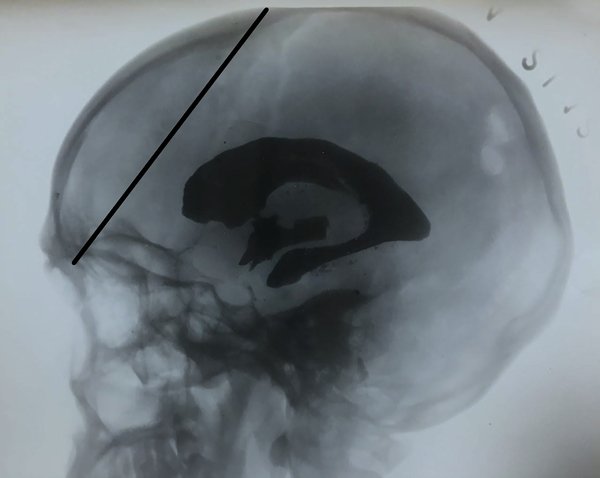 Figura 5: En esta ventriculografía positiva, iodoventriculografía, es clara la relación entre los cuernos frontales y las referencias óseas. Intentar una trayectoria hacia la sutura coronal puede no alcanzar un sistema ventricular moderadamente dilatado. Orientar la aguja hacia la sutura sagital algunos centímetros posteriores al bregma posibilitará el acceso a mano alzada del cuerno frontal. Como detalle se aprecian los orificios parietales de punción. Imagen ventriculográfica (histórica) cortesía del Dr. Matías Baldoncini.