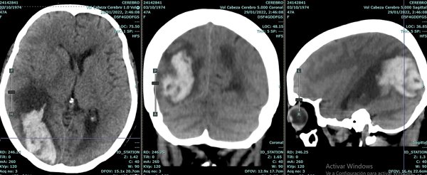 Figura 9: Hemorragia occipital derecha que evolucionó favorablemente con tratamiento conservador. La angioTC de encéfalo no mostró lesiones vasculares subyacentes. Se aprecia secuela parenquimatosa contralateral córtico-subcortical.