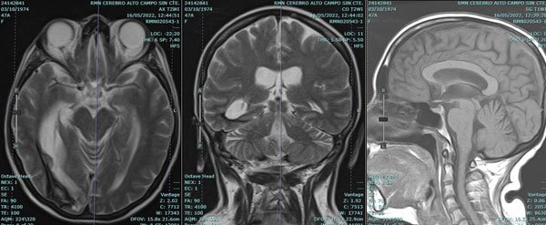 Finalmente, y luego de 45 días de la PTO inicial, logró derivarse a un centro de rehabilitación. Una RMN de control a los 3 meses mostró secuelas menores a nivel parenquimatoso y ausencia de hidrocefalia (Figura 10). A 8 meses del episodio inicial la paciente es independiente, refiere trastornos mínimos en la memoria anterógrada, y deambula por sus propios medios. Al examen neurológico se constata hemianopsia homónima derecha (Figura 11).