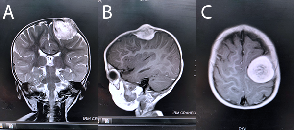 Figura 1: RM de encéfalo en donde se puede apreciar en a) secuencia ponderada T2 coronal, lesión ocupante de espacio extra-intracraneal en región frontal izquierda, hiperintensa, homogónea, de bordes bien definidos, con un mayor componente intracraneal, b) secuencia ponderada T1 contrastada sagital y c) secuencia ponderada T1 contrastada axial, en donde se puede observar el efecto de masa sobre el cerebro subyacente.