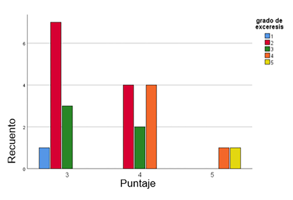 Figura 2: pacientes con distintos grados de exéresis medido en Simpson y su relación con el puntaje obtenido de nuestra escala.