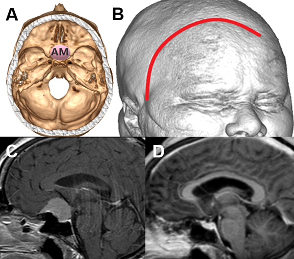 Figura 3: Paciente con meningioma de base de cráneo anteromedial (AM) (1 punto), tamaño menor de 5 cm (1 punto), sin invasión ósea (1 punto), puntaje total: 3, alta probabilidad de resección total. A: localización de lesión en base de cráneo. B: reconstrucción 3D con abordaje. C: resonancia con contraste corte sagital prequirúrgica. D: resonancia con contraste corte sagital posquirúrgica con resección total.