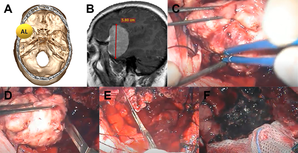Figura 4: Paciente con meningioma de base de cráneo anterolateral (AL) (1 punto), tamaño más de 5 cm (2 puntos) sin invasión ósea (1 punto), total: 4 puntos, moderada probabilidad de resección total. A: localización de lesión en base de cráneo. B: resonancia con contraste corte sagital prequirúrgica. C: imagen intraoperatoria en donde se observa meningioma con plano aracnoideo. D: vaciamiento y reducción de tamaño con bisturí hoja 11. E: resección parcial de duramadre y coagulación de la misma. F: lodge quirúrgica sin remanente tumoral, resección Simpson 2.