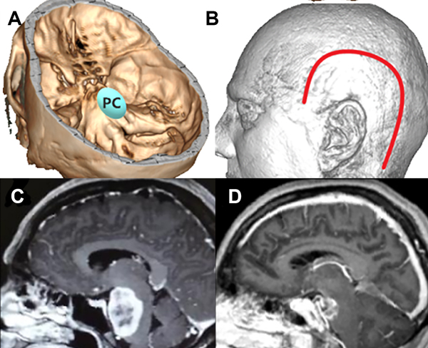 Figura 5: Paciente con meningioma de base de cráneo petroclival (PC) (2 puntos), en su diámetro máximo midió 5 cm (2 puntos) sin invasión ósea, total: 5 puntos, baja probabilidad de resección total. A: localización de lesión en base de cráneo. B: abordaje realizado combinado. C: resonancia con contraste corte sagital prequirúrgica. D: resonancia con contraste corte sagital posquirúrgica con resección subtotal de lesión.