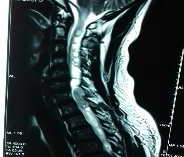 Fig. 1: RM en secuencia ponderada en T2, donde se observa lesión intrarraquídea ocupante de espacio en la porción cervical baja C7- T1, con siringomielia acompañante, supra e infralesional.