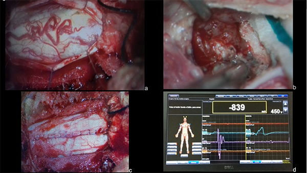 Fig. 2: Fotos intraoperatorias que muestran médula cervical en su cara posterior en nivel C7-T1, en la que se pueden observar vasos espinales y engrosamiento del diámetro medular (a), lecho quirurúgico posterior a resección completa de lesión intraxial(b), durrorrafia hermética “a sello de agua” (c) y registro neurofisiológico intraoperatorio (d).
