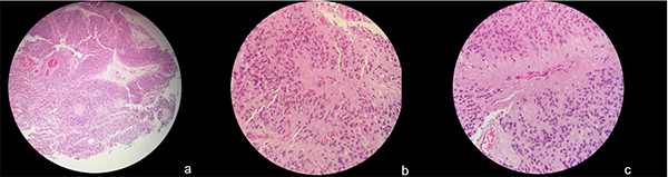 Fig 3: Fotos histopatológicas (Hematoxilina & Eosina, 40x), en donde se obserba neoplasia glial moderadamente celular compuesta por células de disposición radial, alrededor de vasos sanguíneos, hialinizados, con zonas anucleares (procesos fibrilares), dando lugar a la formación de pseudorrosetas (a), las cuales se encuentran compuestas por células con núcleos de redondeados a ovales con distribución de la cromatina en “sal y pimienta” y eventuales nucléolos, procesos fibrilares anucleares -material eosinófilo- (b y c).