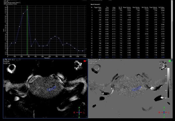 Estas secuencias permiten una evaluación cualitativa con valoración subjetiva del pasaje del LCR a través de las cisternas (Figura 1) y una valoración cuantitativa de la velocidad (Figura 2). La adquisición de las mismas se realiza de forma coordinada con el latido cardíaco (gatillado mediante el censado por el electrocardiograma o curva de pulso).13