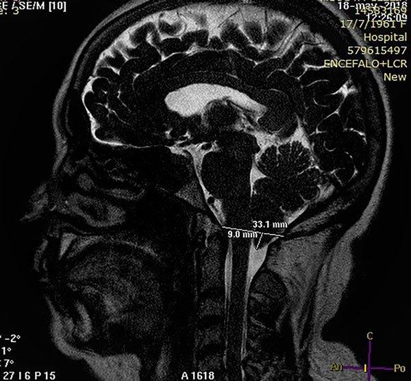 Figura 3: Caso 1. Imagen sagital de RM de cerebro ponderada en T2 de alta resolución que muestra un descenso amigdalino de 9 mm.
