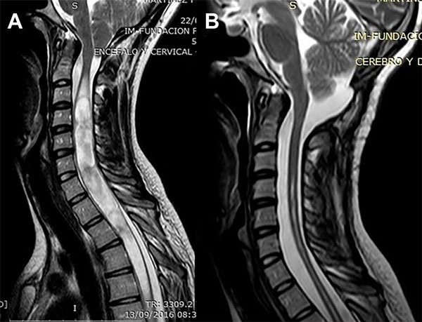 Figura 4: Caso 2. A: RM de columna cervical en plano sagital ponderada en T2 que muestra una siringomielia cervicodorsal extensa con ocupación completa del canal. B: RM de columna cervical en plano sagital ponderada en T2 postoperatoria que muestra la resolución de la siringomielia.