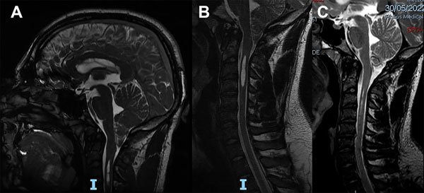Figura 7: Caso 5. A: RM de cerebro en plano sagital ponderada en T2 que muestra el descenso amigdalino de 17 mm de configuración de bordes agudos y el extremo proximal de una siringomielia cervical. B: RM de columna cervical en plano sagital ponderada en T2 que muestra una siringomielia entre C3 y C4. C: RM de columna cervical en plano sagital ponderada en T2 que muestra la resolución de la siringomielia.